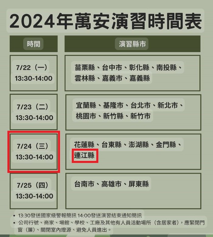 馬祖訂於113年7月24日(星期三)下午1330至1400時,實施30分鐘警報傳遞與發放、疏散避難、交通(人、車管制)及其他必要管制等實作演練,各單位若於演習時段辦理活動,請及早因應與妥處,俾利活動順利進行。演習警報發布後,人車請遵守警察及民防執勤人員引導,就近實施疏散避難,各機場、港口之飛機、船舶、臺鐵、高鐵、高速公路及捷運、輕軌車輛,均照常起降、靠離與行駛,其下飛機(船舶、車輛)旅客、接送親友與下交流道車輛,仍須實施防空疏散避難。