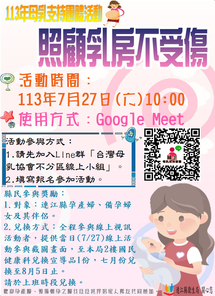 2.兌換方式:全程參與線上視訊活動者,提供當日(7/27)線上活動參與截圖畫面,至本局2樓國民健康科兌換宣導品1份,七月份兌換至8月5日止。