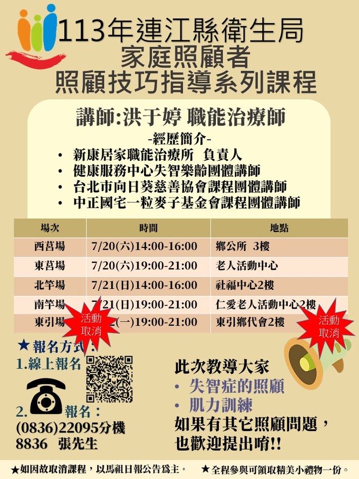 東引的鄉親大家好,原定於7月22日(一)19:00-21:00舉辦家庭照顧者照顧技巧指導系列活動東引場,因颱風來襲,取消辦理活動,造成各位鄉親的不便,敬請見諒。