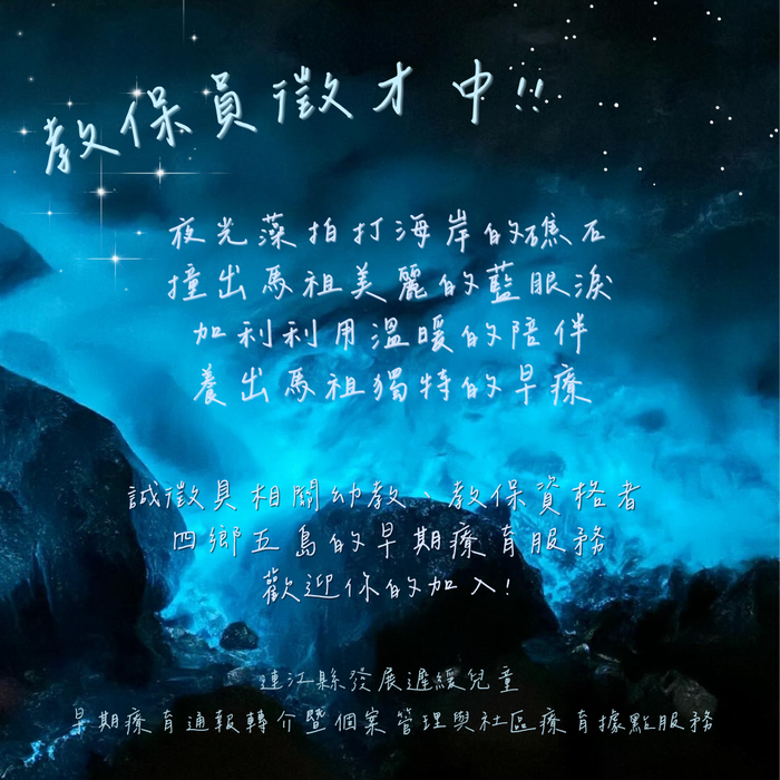 還請貴單位協助轉發週知,並請有意應徵之夥伴參考連江縣發展遲緩兒童通報轉介暨個案管理與社區療育據點徵才資訊(如附件)