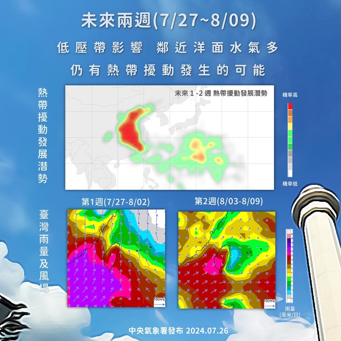 7/27、7/29及7/30有些短暫陣雨或雷雨的機會