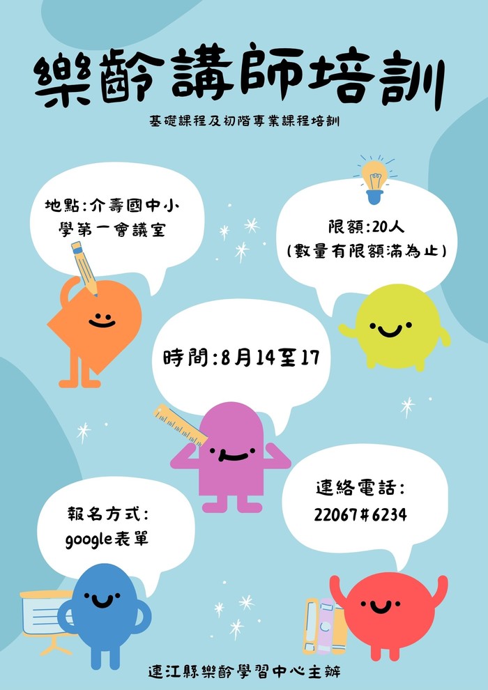 連江縣113年度樂齡學習一般講師培訓 --閱讀人次 : 1033 連江縣辦理113年度樂齡學習專業人員(一般講師)培訓計畫
