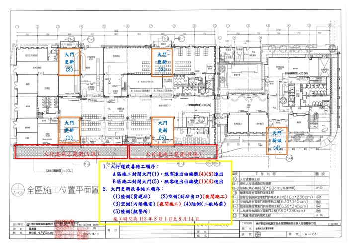 4. 施工內容:「更換航廈大門」及「重新鋪設人行道路面」等。