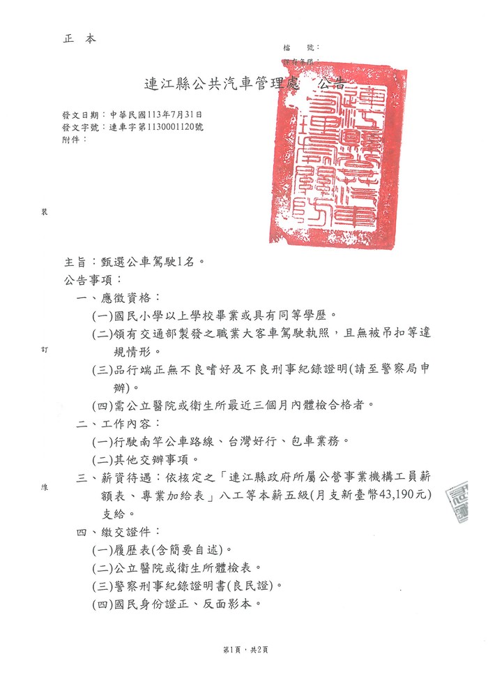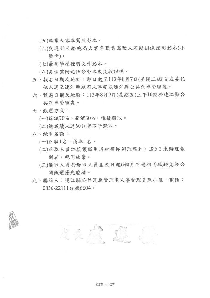 連江縣公共汽車管理處甄選公車駕駛1名