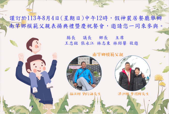 為慶祝113年父親節,南竿鄉公所訂於8月4日(星期日)中午12時假神辳居餐廳舉辦南竿鄉模範父親表揚典禮暨慶祝餐會活動,誠摯邀請設籍在南竿鄉的爸爸們一同參加。