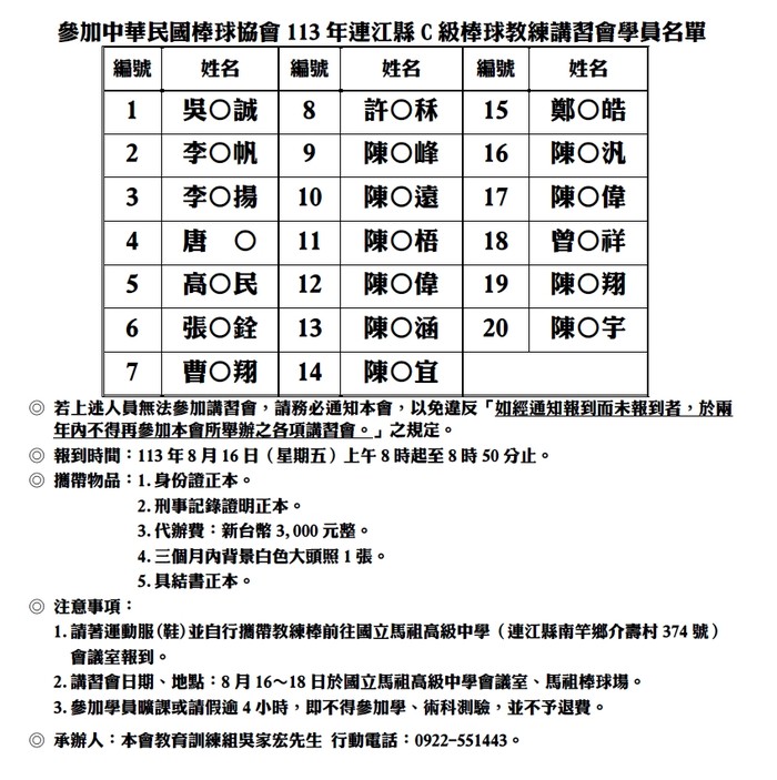 連江縣C級棒球教練講習會學員名單