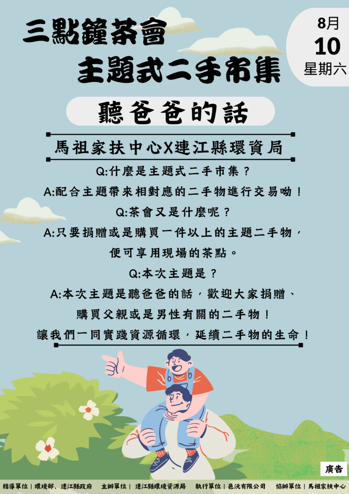 連江縣環境資源局舉辦「三點鐘茶會主題式環保二手市集」又來啦!今年第二場於8月10日(六)下午三點至五點於家扶中心(連江縣南竿鄉164號)舉辦,屆時現場備有茶水、點心,讓前來的鄉親可以相聚品嘗,好似夢遊仙境般,定時定點的下午茶茶會。
