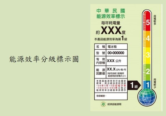4、 電冰箱能源效率分級為1至5級(1級為用電較少,5級為用電較多),若屬同一分級,則選購每年耗電量較少者。