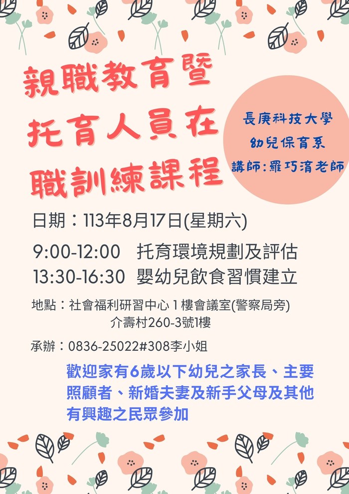 113年度親職教育暨托育人員在職訓練 --閱讀人次 : 599 連江縣113年度親職教育暨托育人員在職訓練