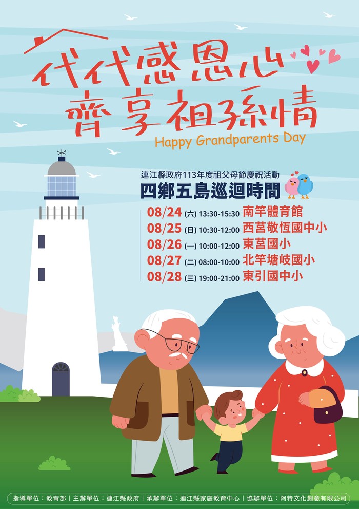 為喚起國人更加重視家庭世代關係,落實傳統核心價值的家庭倫理與品德教育,彰顯祖父母對家庭和社會的貢獻與重要性,連江縣政府每年由教育部指導,連江縣家庭教育中心承辦,在8月下旬舉辦祖父母節活動,去年更首度巡迴四鄉五島,獲得縣民熱烈迴響。