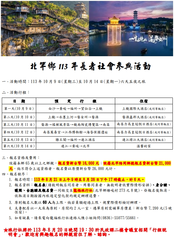 旅行社將於113年8月20日晚間19:30於民政課二樓會議室招開「行程說明會」,歡迎有興趣報名的鄉親前往了解、諮詢。