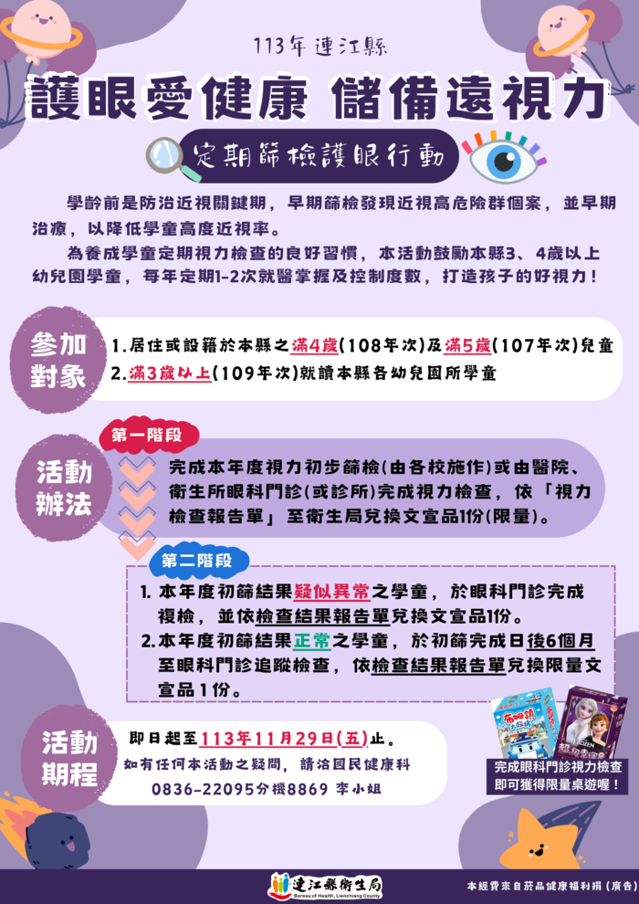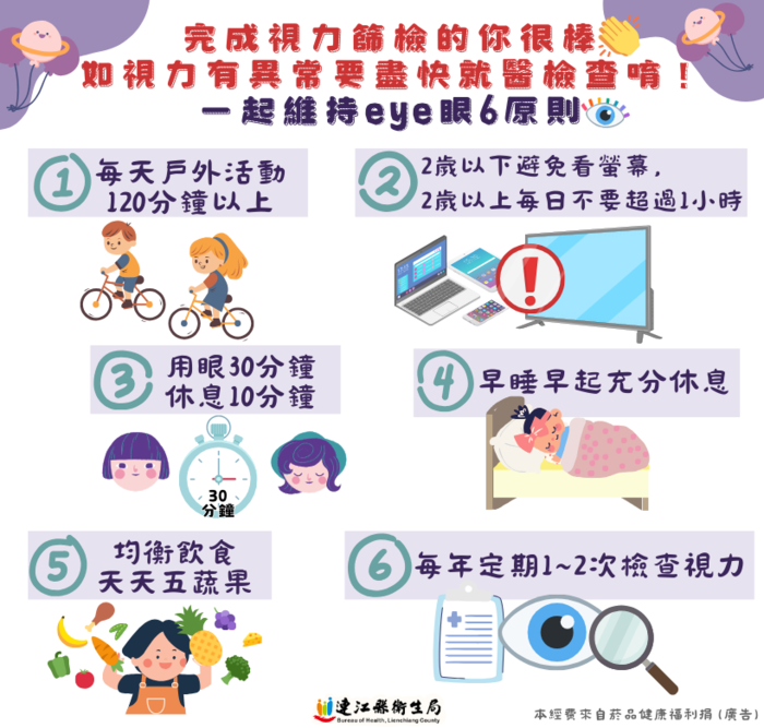 6歲以前是兒童視力發展的關鍵期,且3~6歲是弱、斜視治療的黃金期,本年度完成視力複檢之學童也要繼續保持定期篩檢習慣,追蹤及掌握視力狀況!