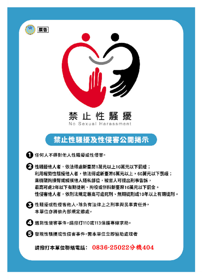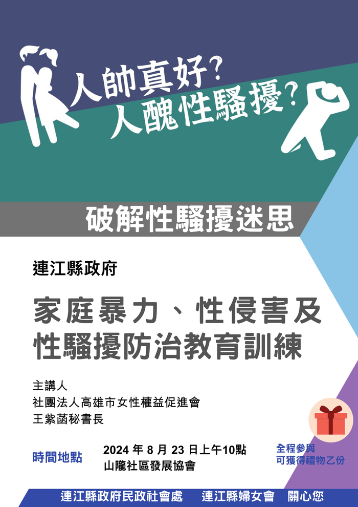一、為加強公共場所及公眾得出入之場所性騷擾防治宣導教育,使民眾能在一個安全、安心的環境洽 公、消費、聚會或娛樂等,落實公共場所及公眾得出入之場所之場所主人防治責任。連江縣政府113年度辦理家庭暴力、性侵害及性騷擾防治教育訓練,歡迎鄉親踴躍參加!