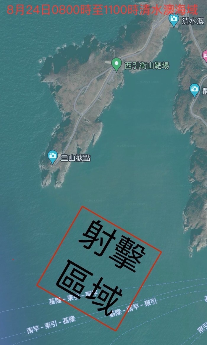 各位鄉親大家好,東引指揮部訂於明(24)日「0800時至1100時」於圖上區域(清水澳周邊海域)實施例行性對海射擊,請周遭船隻、各式航空器及釣客避免進入射擊區域,以確維安全,造成鄉親不便,敬請見諒。
