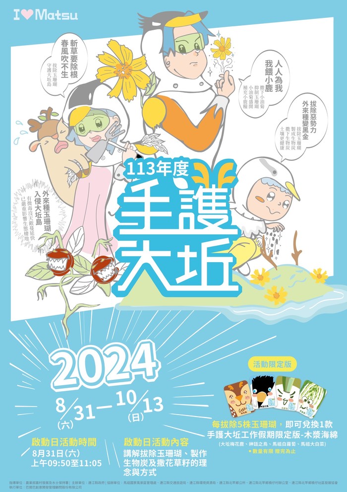 活動方式:於大坵島商店街活動服務區報名領取工具及草籽,服務人員將解說相關注意事項並指引主要拔除玉珊瑚區域,拔除後將玉珊瑚完整裝入袋內並撒下草籽,完成後回到活動服務區兌換限定版手護大坵工作假期木漿海綿活動期間,連根拔除玉珊瑚至商店街活動服務區,即可兌換活動限量版「手護大坵工作假期木漿海綿」,每5株可兌換1片木漿海綿(共4款)。