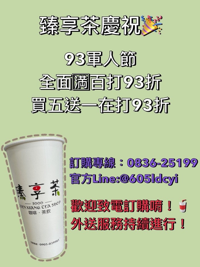 臻享茶9/3軍人節 軍人優惠滿百93折