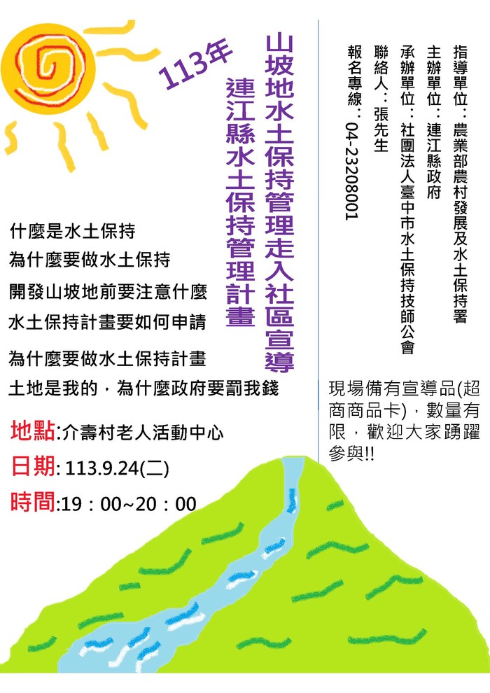 9/24~25水保服務團駐點及社區宣導 --閱讀人次 : 712 == 連江縣水土保持服務團駐點服務 ==