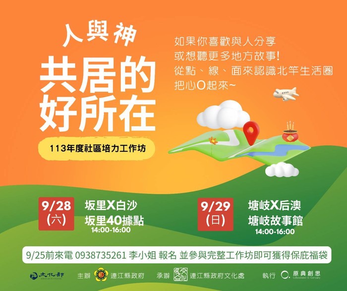 連江社區營造中心今年度舉辦的「社區培力工作坊」將於9月28日及29日分別在坂里40據點與塘岐故事館舉行,活動時間為下午2點至4點。此次工作坊將透過實作練習、生活經驗分享與共同討論三個階段,探索社區與文化的深層連結。