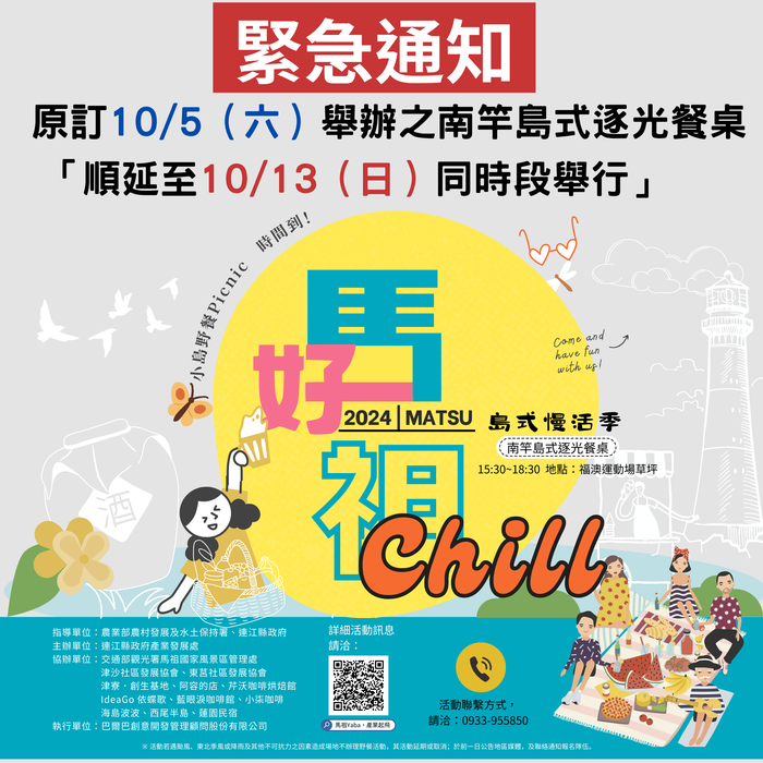 緊急公告!10/5活動延期至10/13 --閱讀人次 : 1818 因颱風山陀兒影響,原定於10/5(六)