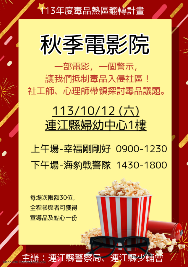 活動以毒品議題相關電影為主軸,透過電影來強化毒品防制的宣教成效,藉由多元的宣導方式讓社區民眾重視毒品防制的議題及相關知識,另聘請具有毒品防制及實務經驗之講師(李怡薇社工師、劉育均心理師),向社區居民宣導毒品防範之重要性,從電影情節結合生硬的反毒資訊,透過分享討論的方式,共同反思社區毒品防制問題。辦理單位:連江縣警察局、連江縣少年輔導委員會