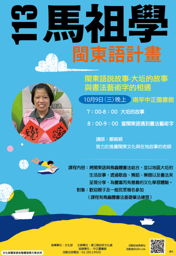 這次我們邀請到曉穎老師,透過大坵歷史的解說、歌曲演唱來讓我們了解大坵,另外也以自身擅長的鳥蟲體畫法字,呈現和閩東語相遇的火花~