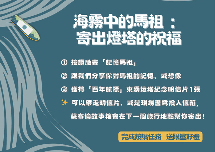 蘇布倫故事箱的台灣最終場,來到基隆塔參加「海塔之市」閱讀市集,響應市集主題「港都情話」,在遙望基隆港的會場,帶來限量 #東湧燈塔紀念明信片,完成指定按讚任務即可獲得~徵求大家 #記憶中的馬祖!明信片也可以選擇現場投入信箱,寄出燈塔的祝福✨