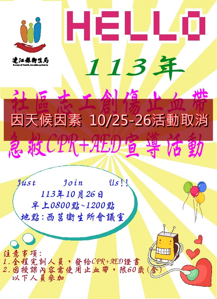 衛生局通知:由於天候因素,10/25-26的活動已經取消。對造成您的不便,我們深感抱歉。謝謝您的理解。