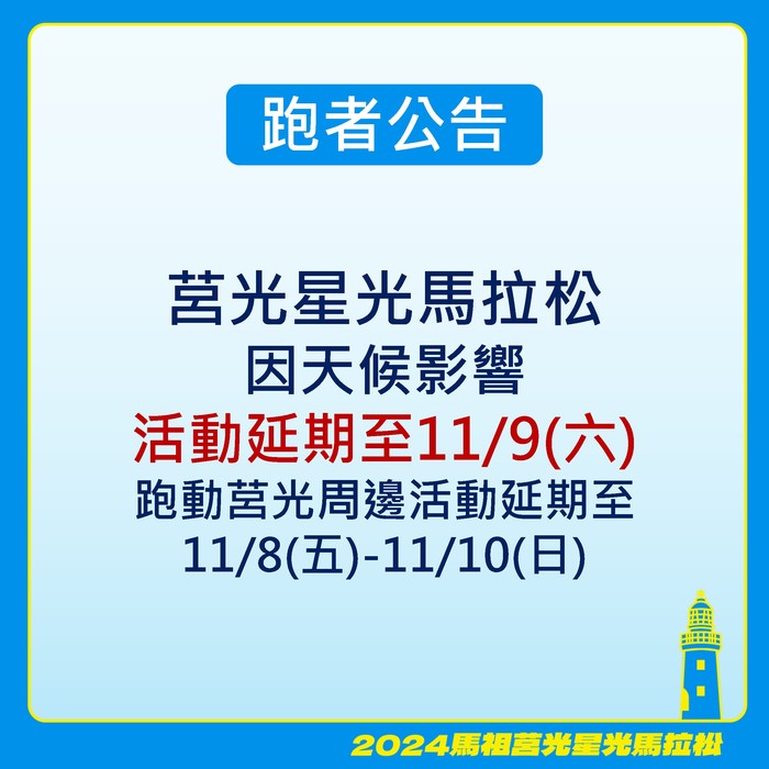 莒光星光馬拉松延期至11/9(六) --閱讀人次 : 730 原定於10/25(五)至10/27(日)舉行的「莒光星光馬拉松」及相關周邊活動,因天候因素將延期至11/8(五)至11/10(日)。