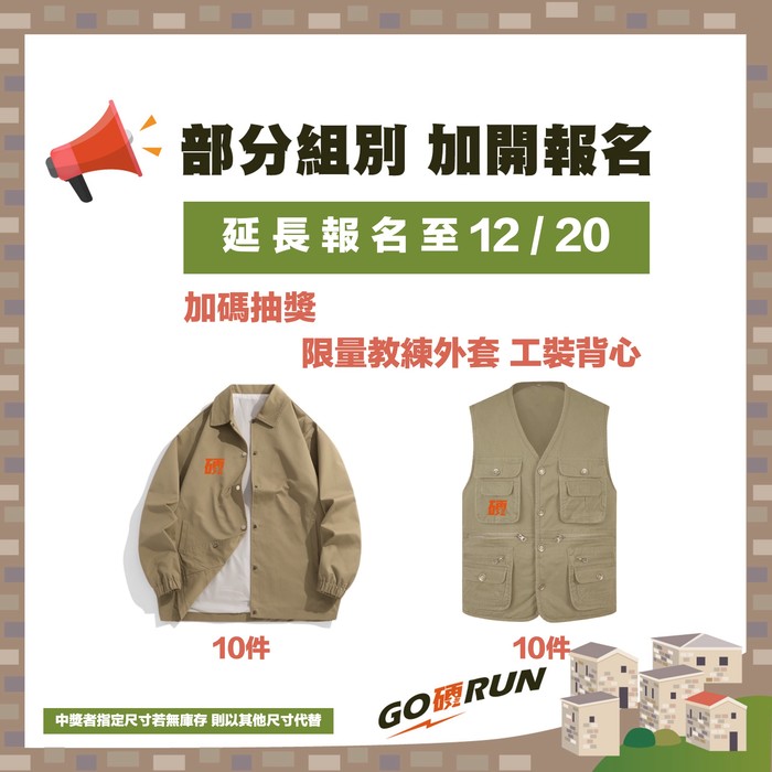 即日起-12/20 23:59 凡報名2025北竿硬地超級馬拉松的跑者(含第一階段報名者),就有機會抽中限量的工裝背心和教練外套呦!✨