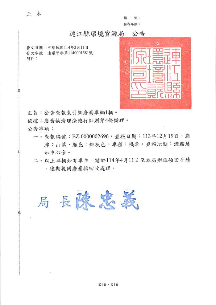 主旨:公告查報東引鄉廢棄車輛1輛。