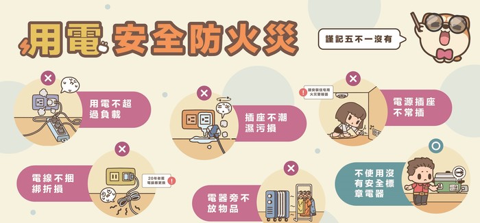 (六)使用電暖器、白熾燈、鹵素燈等發熱電器時,應與周圍可燃物(衣服、報紙等)保持安全距離,不要使用電暖器烘衣服,避免發熱電器長時間運轉