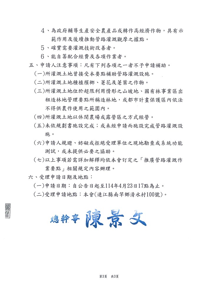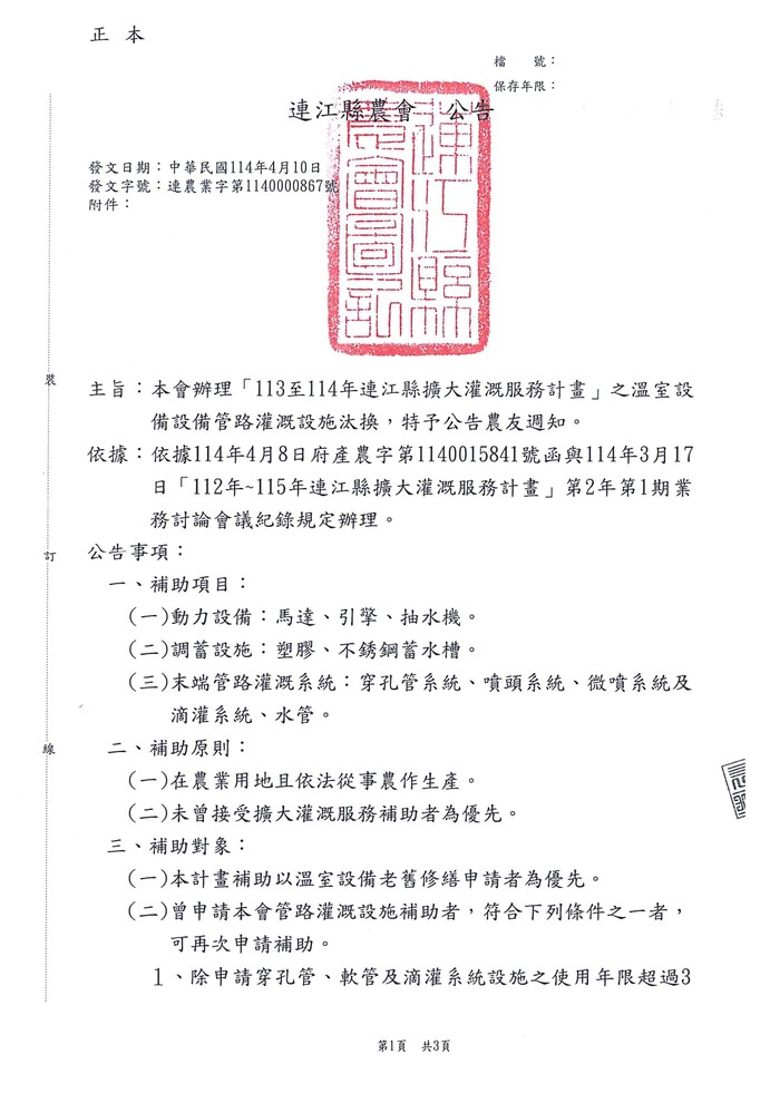 連江縣擴大灌溉溫室設備汰換補助 --閱讀人次 : 491 本補助自公告日起至114年4月23日17點為止。