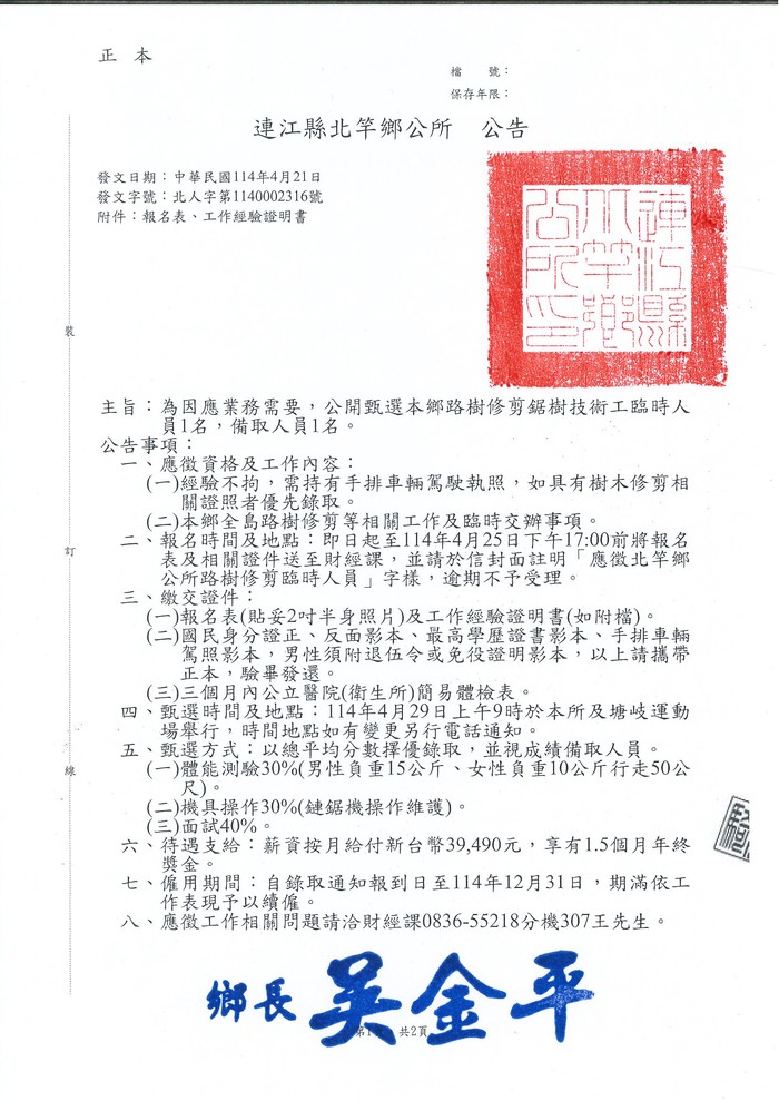 北竿鄉公所甄選路樹修剪臨時人員1名