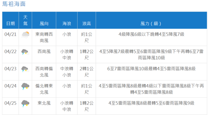 風浪:4/21晚起至4/22鋒面前緣西南風增強,馬祖有8至9級強陣風,最大浪高約1.5至2.0米;