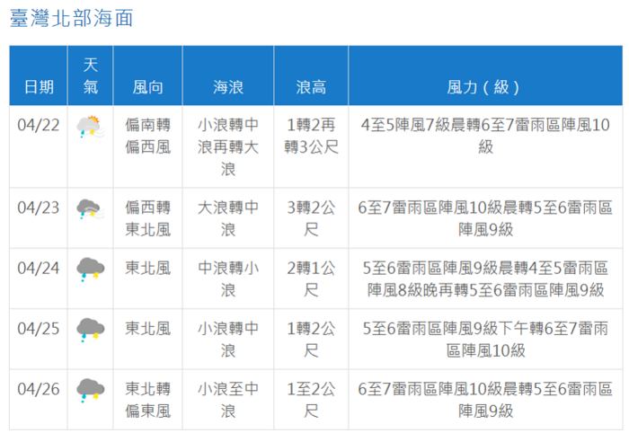 4/23海面風向由西南風轉為東北風;4/25至4/26東北風增強,有8至9級強陣風,浪高約1.5至2.5米。