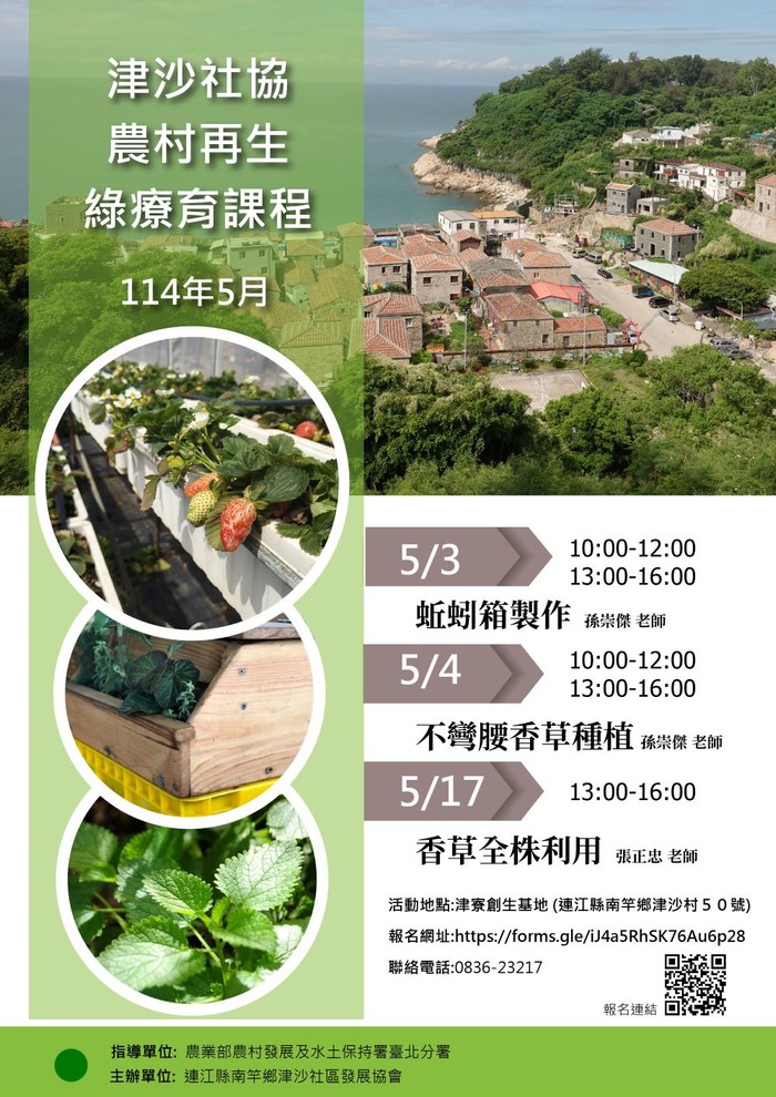 農村再生綠療癒課程-津沙社協主辦 --閱讀人次 : 849 由 #津沙社區發展協會 主辦的「農村再生綠療癒課程」,即將於5/3展開豐富趣味又兼顧環境友善的蚯蚓箱製作教學活動,5/4及5/17則是指導香草種植和全株利用教學,歡迎民眾、親子一起踴躍參加。