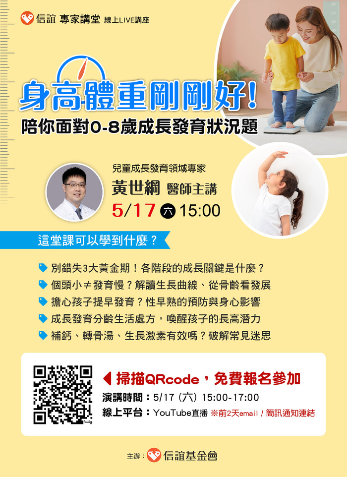 信誼專家講堂將於2025年5月17日(六)下午3:00-5:00舉辦【身高體重剛剛好!陪你面對0-8歲成長發育狀況題】線上LIVE講座,邀請爸媽免費報名參加。
