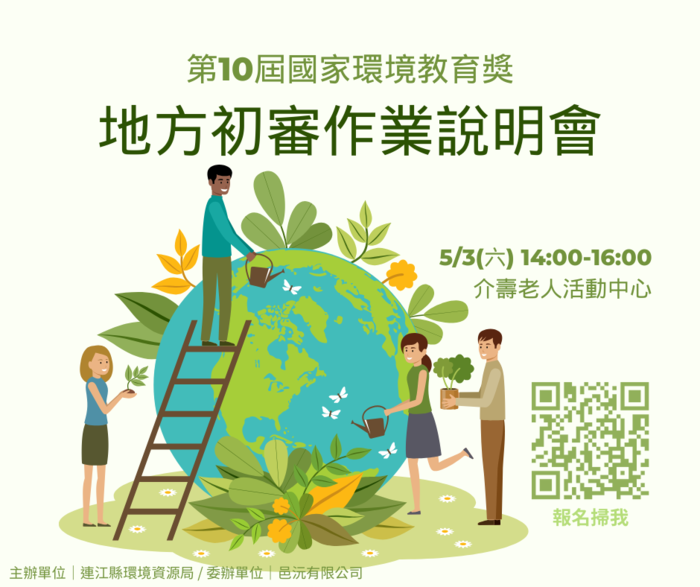 國家環境教育獎 地方初審說明會 --閱讀人次 : 691 你也關心環境、熱愛這片土地嗎?第10屆國家環境教育獎地方初審說明會開跑了!