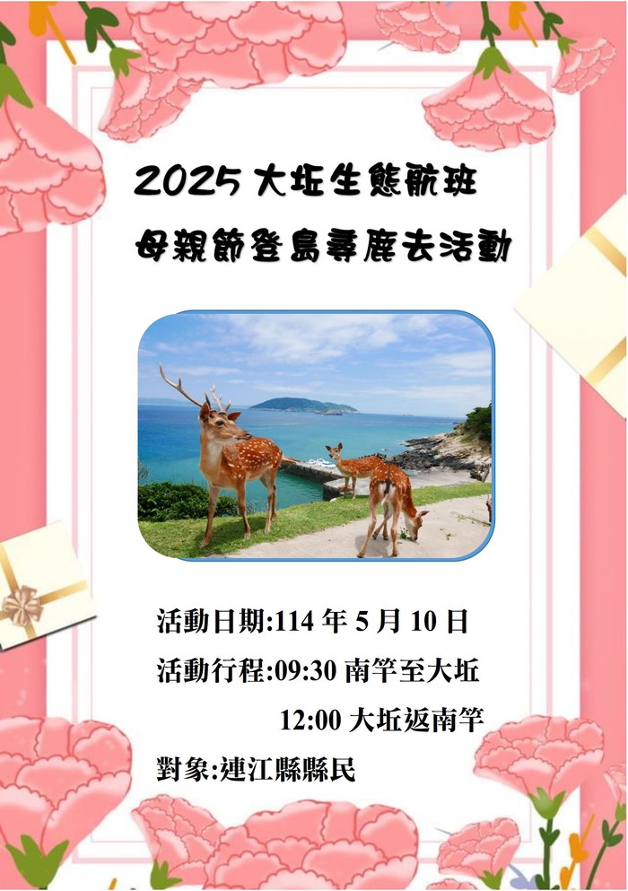 114年大坵生態航班母親節活動已額滿 --閱讀人次 : 1177 溫馨五月,為迎接母親節,感恩天下媽媽們的付出,連江縣交通旅遊局「2025大坵生態旅遊推廣船舶暨行銷委託案」承攬廠商南北海運公司提供49個連江縣民免費名額,邀請媽媽們前往大坵島與梅花鹿共度母親節,享受一家人戶外踏青時光,歡迎鄉親踴躍報名參加。
