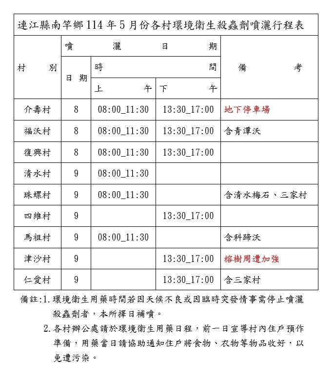 南竿鄉5月份各村殺蟲劑噴灑行程表