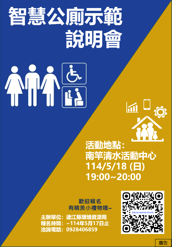 連江縣環境資源局於114年5月18日(星期日)19:00~20:00辦理智慧公廁示範說明會,增進大眾對智慧公廁的認識,進而推廣智慧城市概念,提升民眾的接受度與使用率。