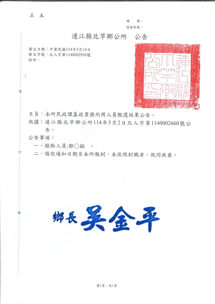 北竿鄉公所民政課墓政約用人員甄選結果公告