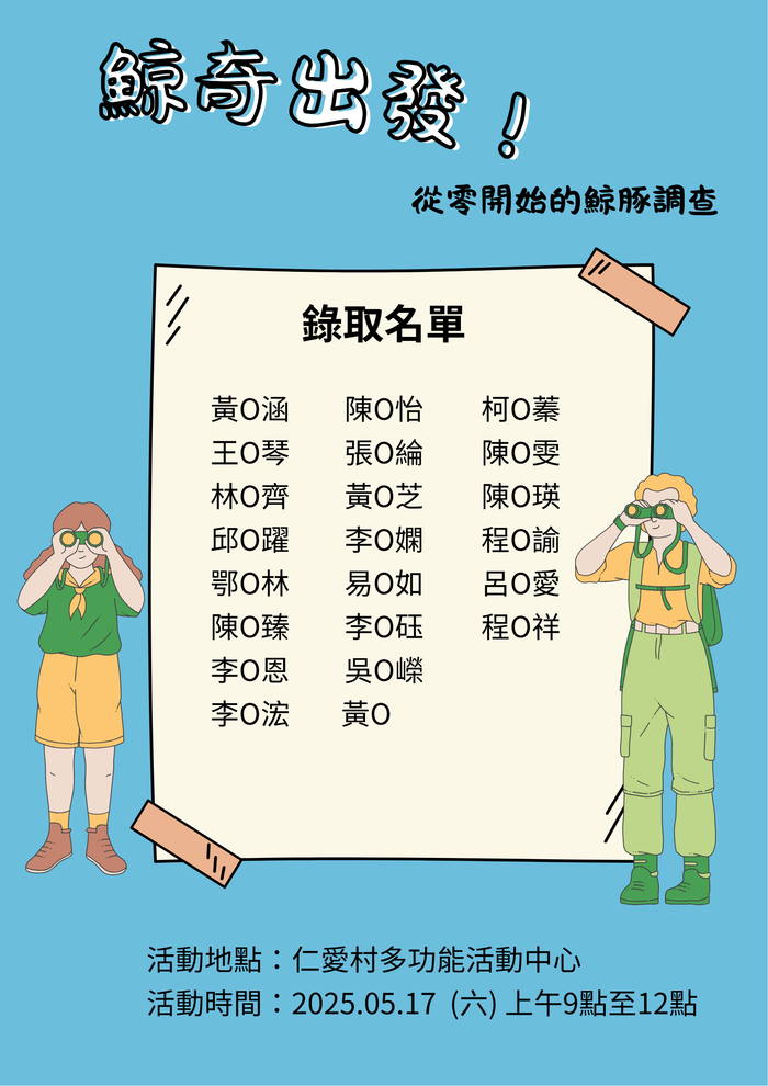 5/17 鯨奇出發 第二波 錄取名單! --閱讀人次 : 693 嗨!大家好,