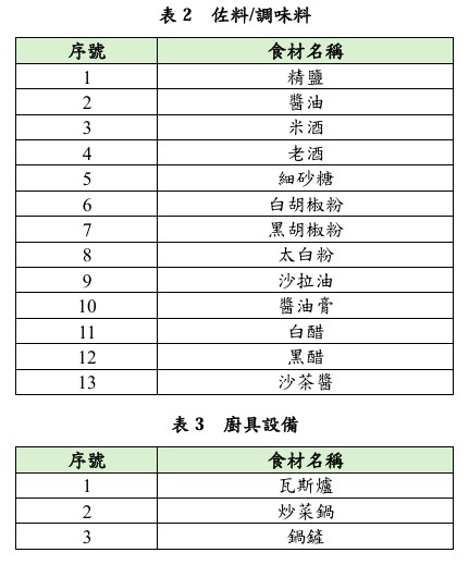 針對活動食材建議、調味品與廚具設備公告說明如下: