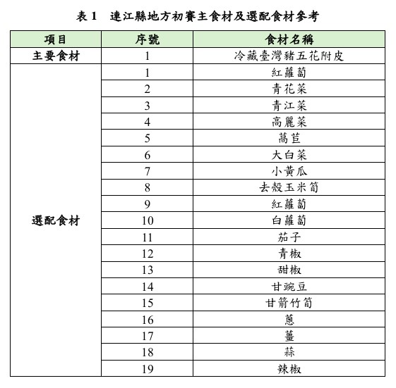 本次競賽以吃全食(零廚餘)、吃格外、食當季、吃在地(低碳排料理)等惜食概念主題為推廣重點,為方便參賽人規劃食譜,提供當季當地常見食材表如下表1供參考,其中之主要食材「冷藏臺灣豬五花附皮」為後續區域賽指定食材,建議參賽者可預作規劃參考。
