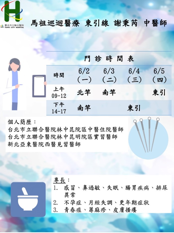 馬祖中醫巡迴醫療114/6/2-6/5由莒光線陳于馨醫師、東引線謝秉芮醫師前往支援服務。