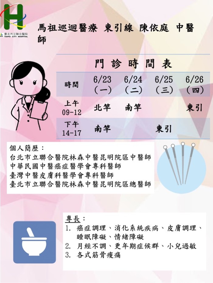 馬祖中醫巡迴醫療114/6/23-6/26由莒光線卓雨青醫師、東引線陳依庭醫師前往支援服務。