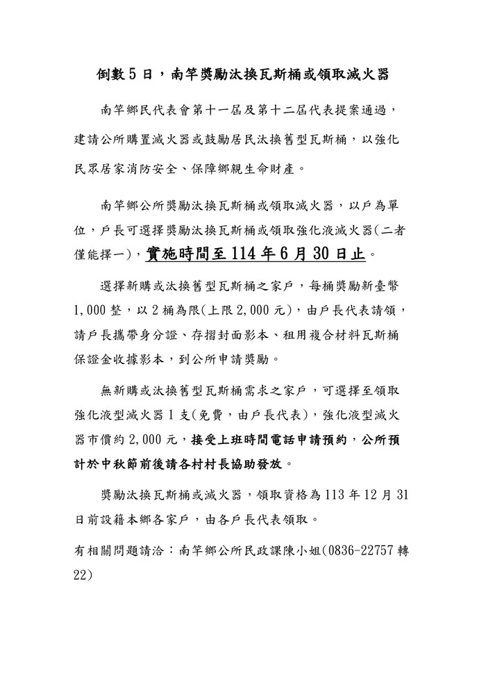 倒數5日,南竿獎勵換瓦斯桶或領滅火器