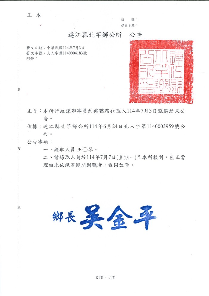 北竿鄉公所辦事員約僱職務代理人甄選結果公告