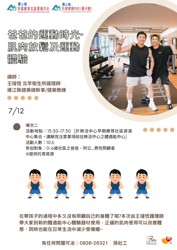 活動地點:15:30-17:30 (於樂活中心早期療育社區資源中心集合,講解完注意事項前往樂活中心之體適能中心)